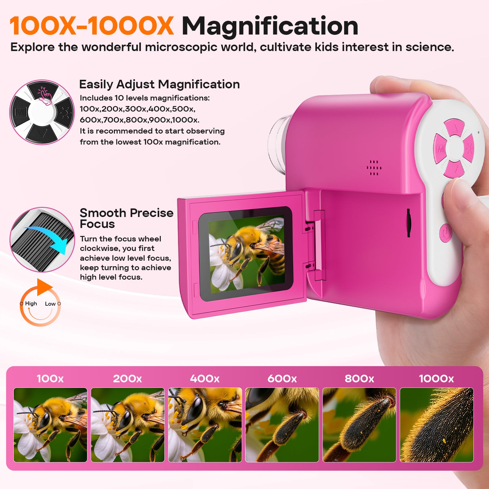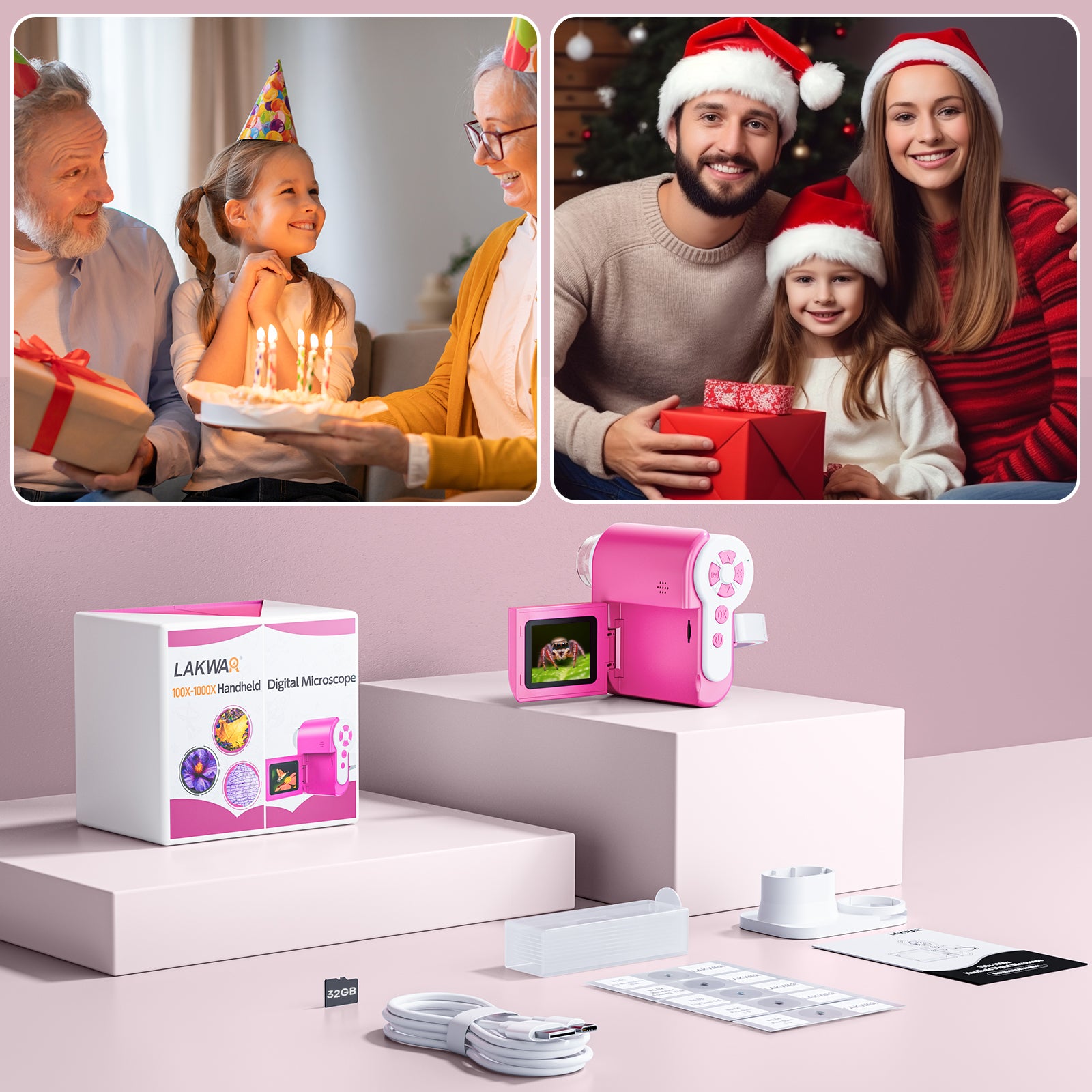 - Suitable for both adults and children.Features a 2-inch DV microscope with an integrated screen.Designed as a handheld HD pocket microscope.Comes with a storage card for convenience.Presented in a gift box, making it ideal for gifting.Available in a vibrant purple color.Equipped with 6-bulb LED illumination for clear viewing.Provides 1080p resolution for high-definition imaging.Its portable, mini design allows for easy transport.Ready to use right out of the box.Allows for capturing and storing images directly.Includes a 32 GB storage card.Supports live-view streaming when connected via USB-C to Windows or macOS systems.Features a 2-inch IPS display for clear visuals.Offers a telescope mode for handheld observation up to 500 meters away.Functions as a fun digital microscope designed for kids' learning.Facilitates instant microscopic and macroscopic discovery.