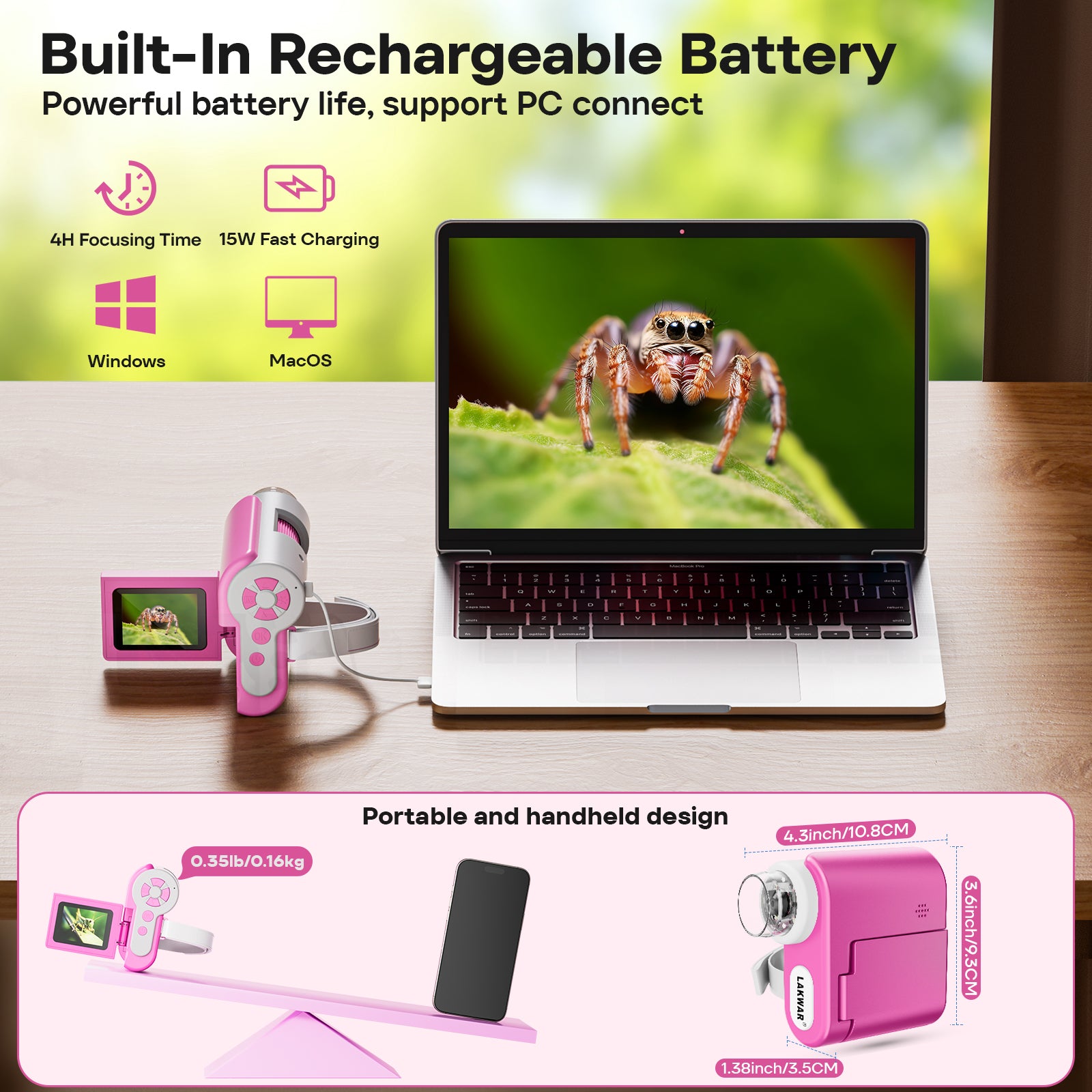 - Designed as a handheld HD pocket microscope.