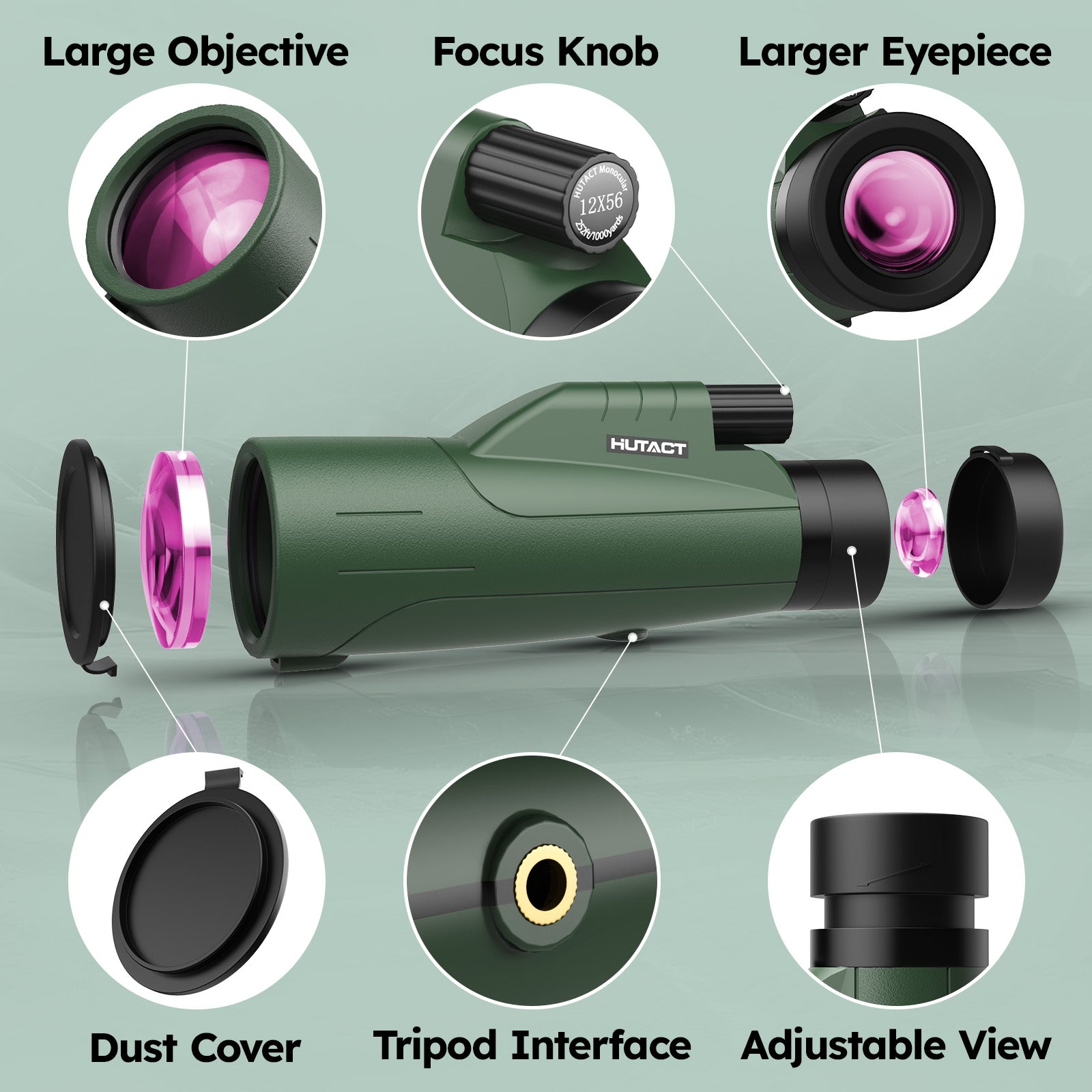 Monocular for Adult, 12x56 mm Monocular HUTACT FMC Clear View Monocular with Phone Clip Tripod for Outdoor Bird Watching Sports Events, All in 1 Monocular Gift for Him