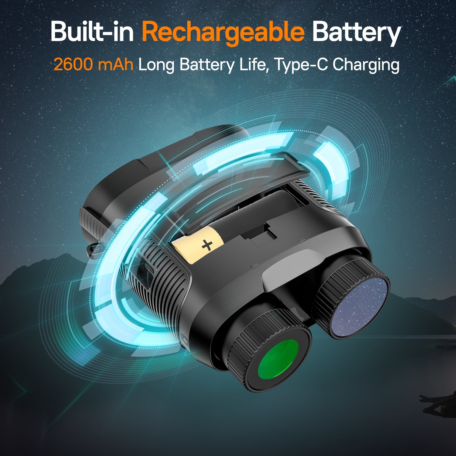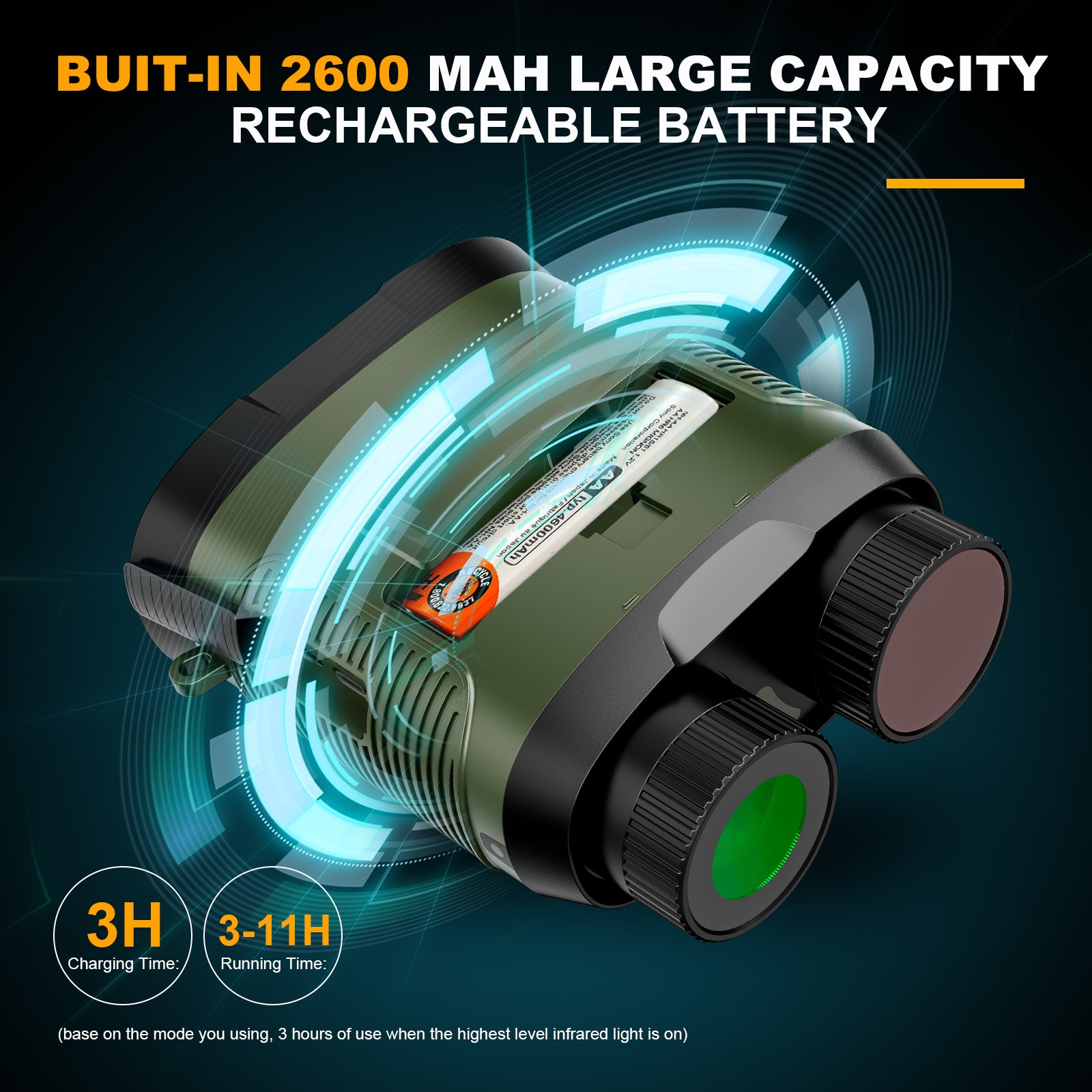 - Long Battery Life Running up to 11 hrs -- Powered by a 2600mAh rechargeable lithium battery, these night vision goggles offer impressive battery life for extended use. Whether you’re out camping, fishing, or tracking wildlife at night, the long-lasting battery ensures you won’t run out of power in the middle of your adventure.
