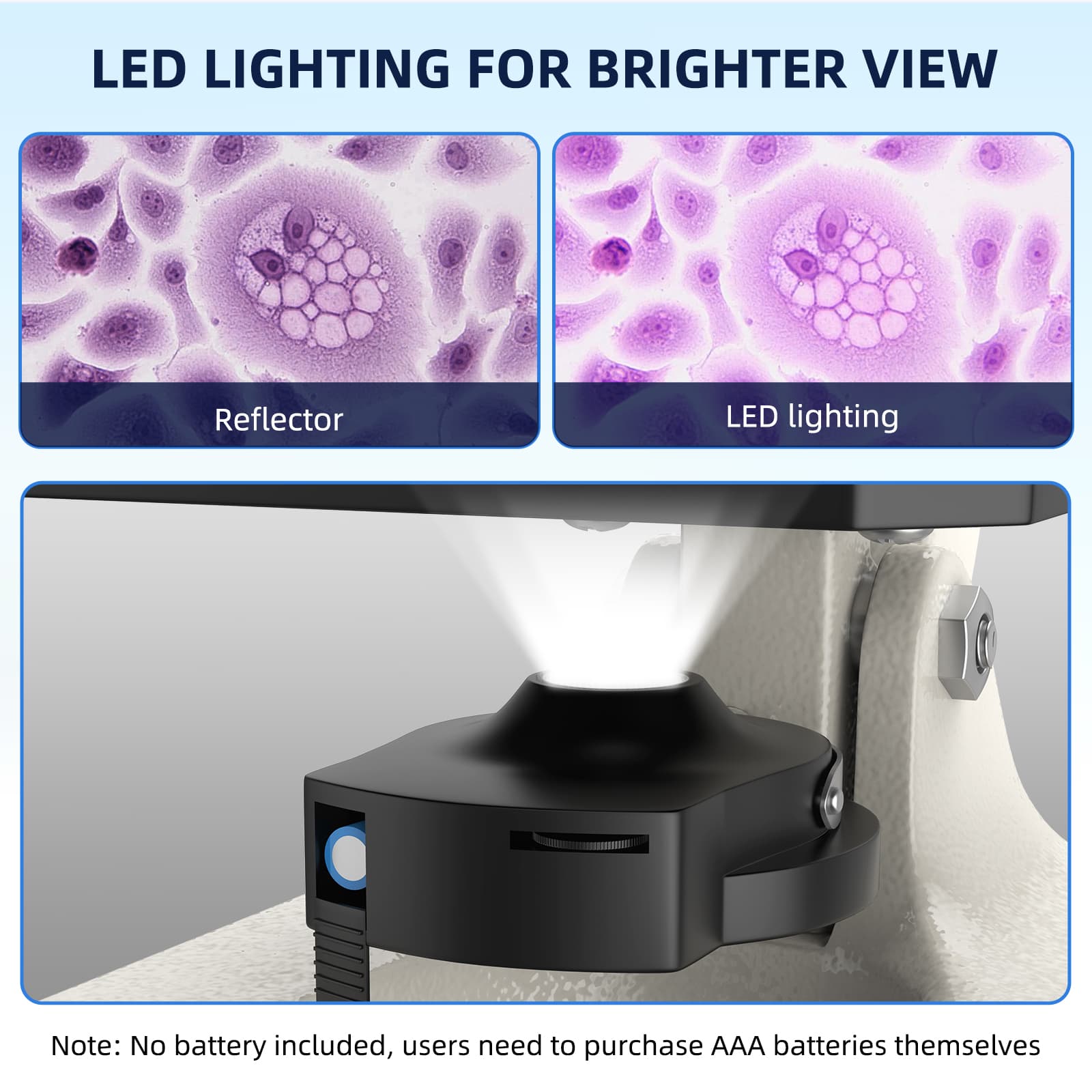 - Multiple Magnification Options -- The beginner microscope includes two eyepieces (H10x and H25x) and three objective lenses (4x, 10x, and 40x), plus a 2x Barlow lens, offering versatile magnification levels.