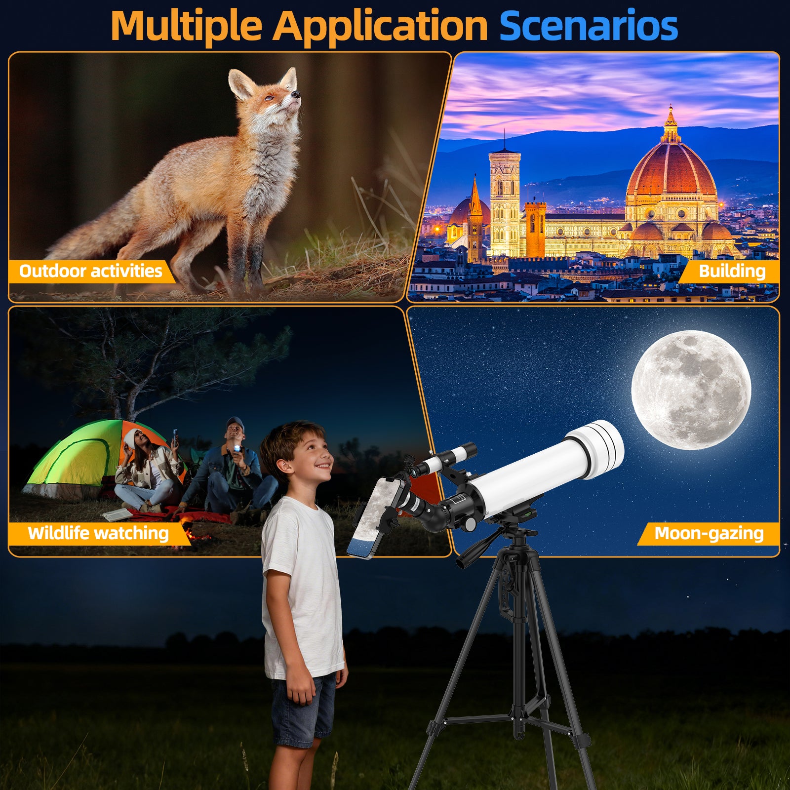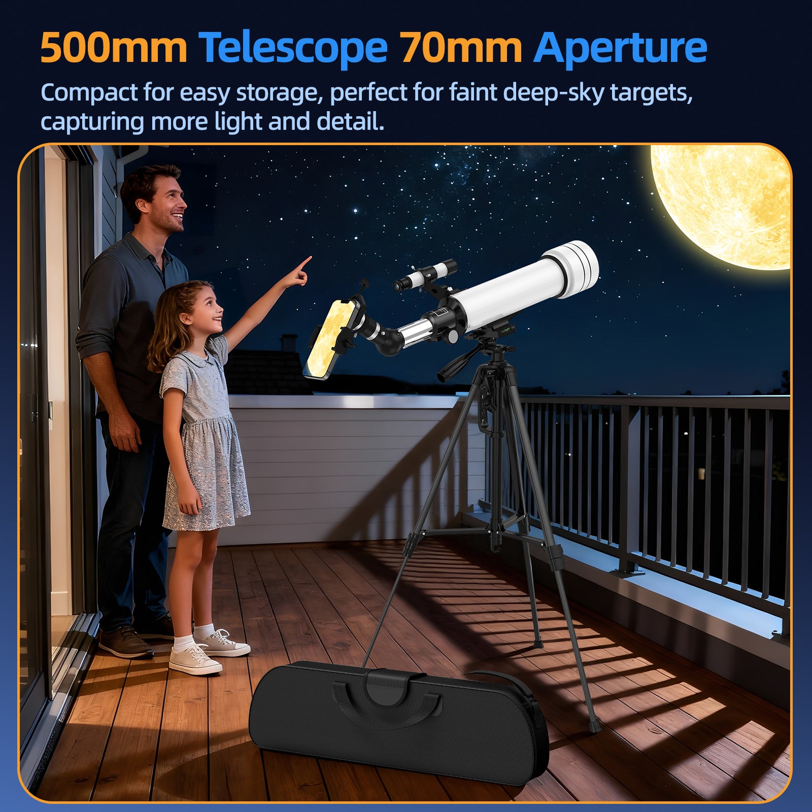 【70 mm Refractor Astronomical Telescope, 500 mm Focal Length, 25x–150x Magnification, Net Weight 4.9 lb, White Complete Kit】